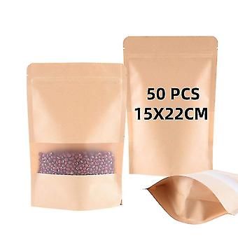 50pcs Kraft Paper Bag With Window, Waterproof And Moisture-proof, Reusable, Suitable For Dried Fruit Coffee Tea