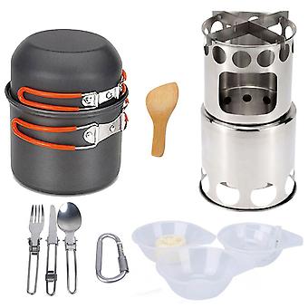 This camping cookware mess kit includes 1 x Big Pot, 1 x Small Pot, 1 x Camping Stove, 1 x Folding Fork, 1 x Folding Spoon, 1 x Folding Cutter, 3 x Bowl, 1 x Bamboo Ladle, 1 x Cleaning Sponge, 1 x Carabiner, 1 x Mesh Storage Bag.