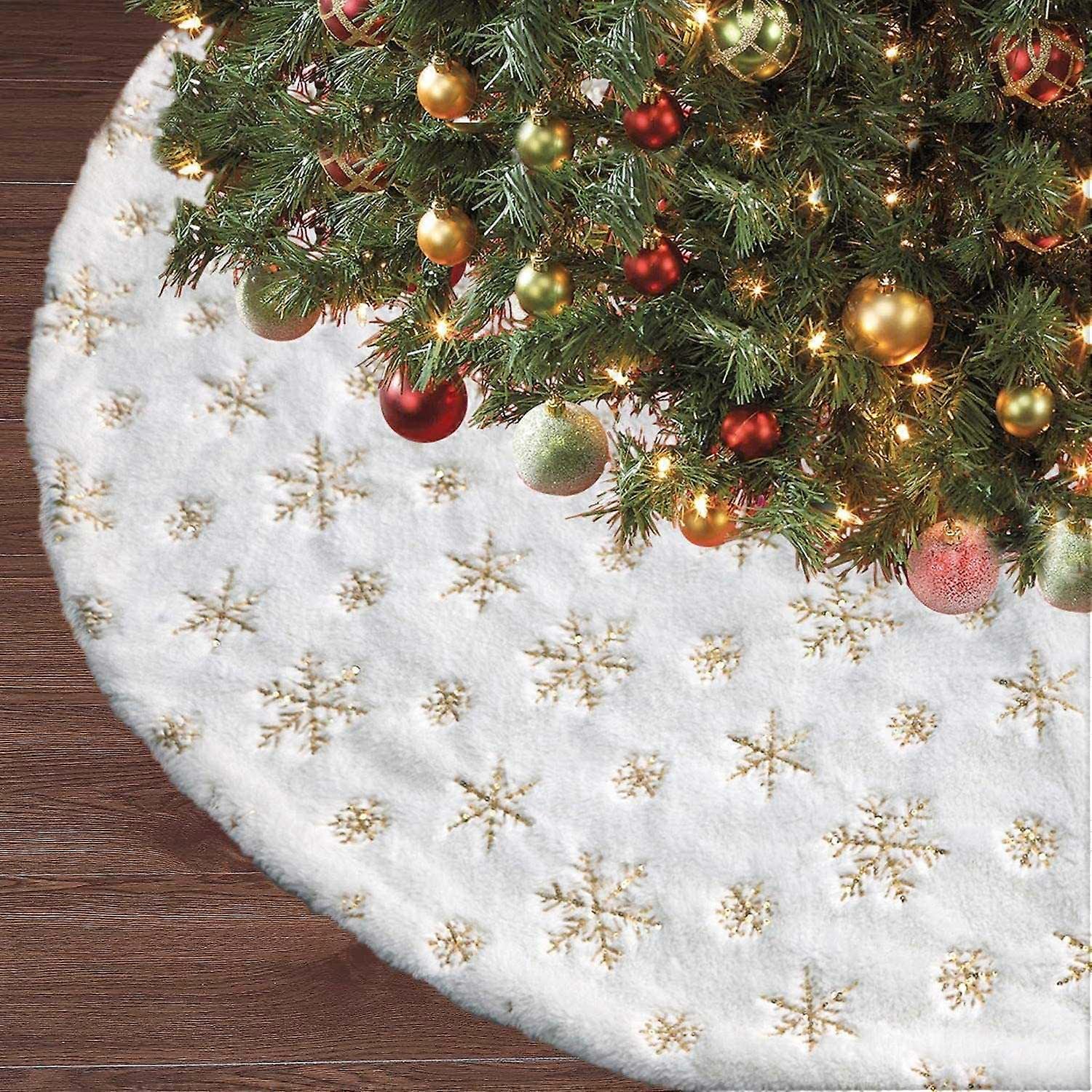 Christmas Fluff Tree Skirt, 48 Inch Gold Sequin Snowflake Tree Skirt, Xmas Plush Tree Mat for Holida