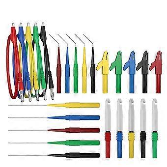 Alligator clip to 4mm plug test lead: 5 Colors identified Back Probes for use on harness connectors, fuel injectors and automotive sensors Test probes: Stainless steel, 0.7mm 135 degree probes leads quickly plug in to permit testing in recessed areas, compatible with standard 4mm plug Probes can easily insert into automotive connectors Probe Max Voltage & Current: 30V /10A Test Lead Length: 40cm material: plastic Color as shown Package Contents: 5PCS Alligator clip to plug test lead (each color x 1) 5PCS 113mm long test probes (5 colors) 5PCS 77mm long Test Probe with PA 5PCS alligator clip 5PCS test probes (135 degree probes) Only the above package content, other products are not included. Note: Light reflection and different displays may cause the color of the item in the picture a little different from the real thing. The measurement allowed error is +/- 1-3cm.